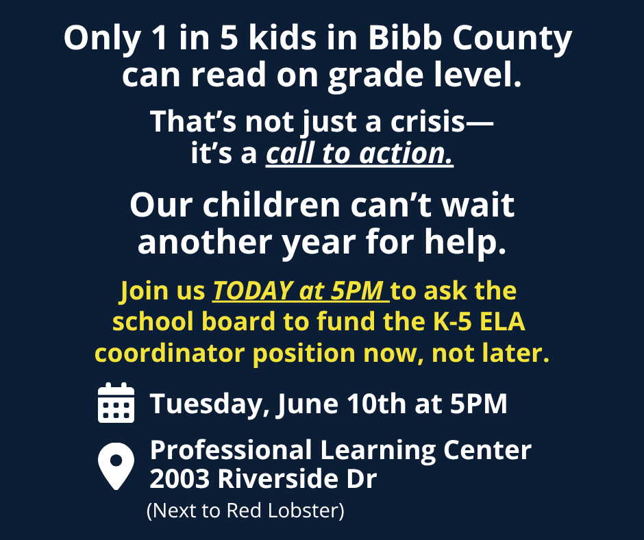 In Bibb County, only about one in five elementary students can read on grade level. Tomorrow June 10th the board is holding a hearing and they need to know that you support hiring an English Language Arts Coordinator.