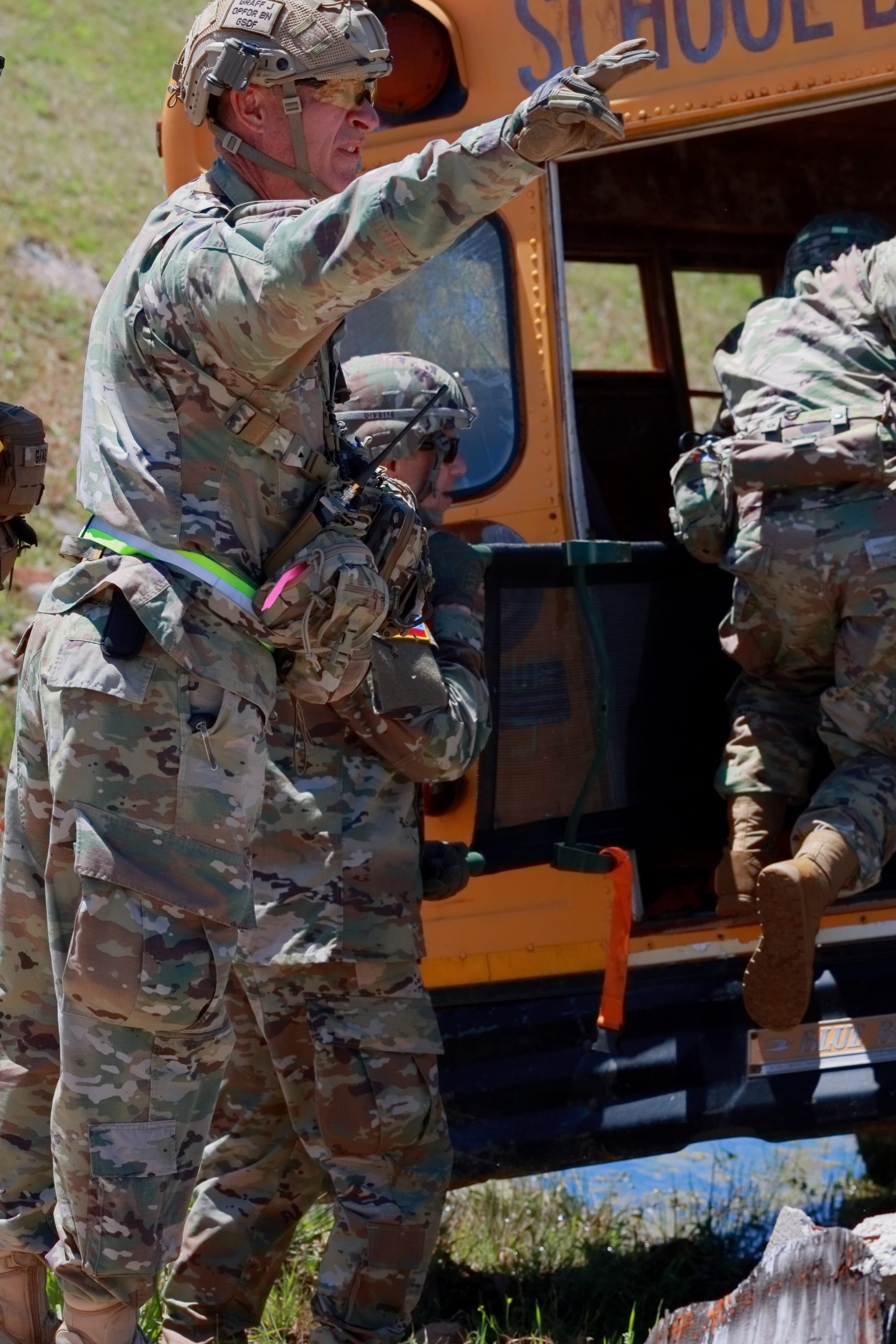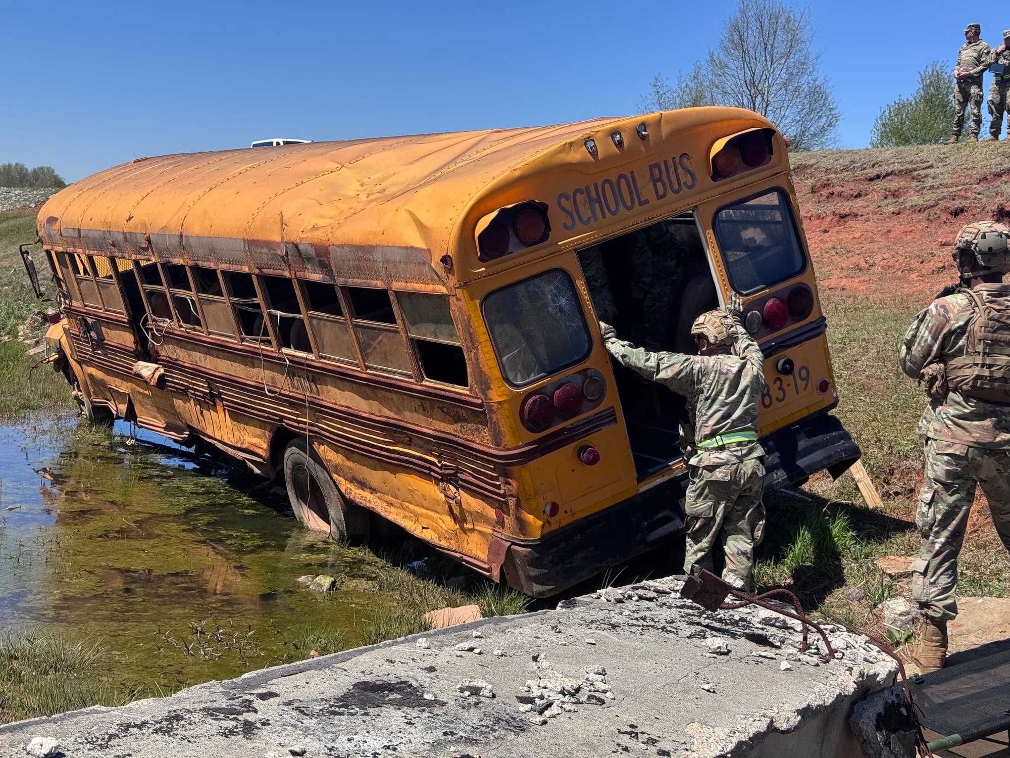 GSDF soldiers search a collapsed bridge and school bus. They extract one role player to safety. Photos by SSG Kerry Hatcher