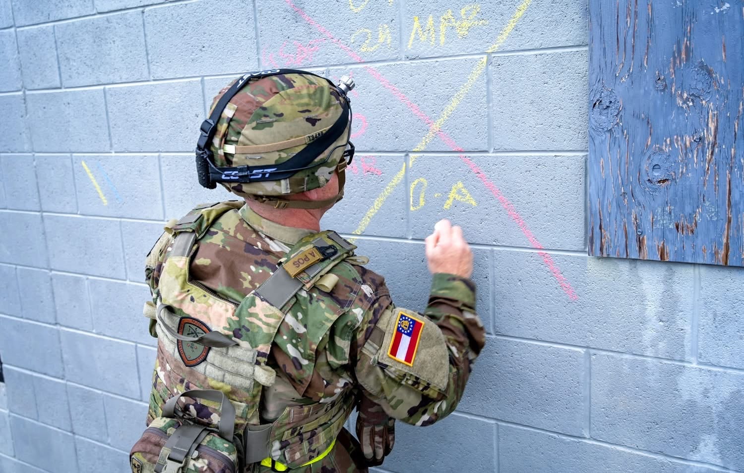 GSDF soldiers execute an urban search and rescue after a simulated earthquake. Buildings are marked as they are searched using standard FEMA markings. Chalk is used for training to ease cleanup. Photos by SSG Kerry Hatcher