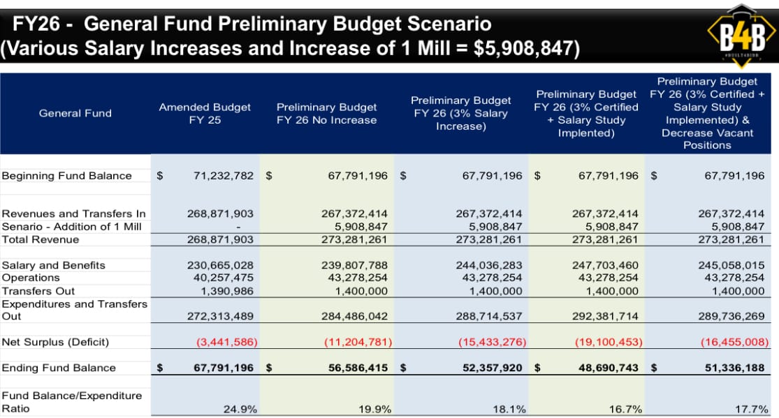 With no raises or other changes the district still faces a $17.1 million dollar deficit. Alternatively, a modest 3% raise for teachers and implementing the salary study findings, would leave the district in the hole by over $25 million dollars.